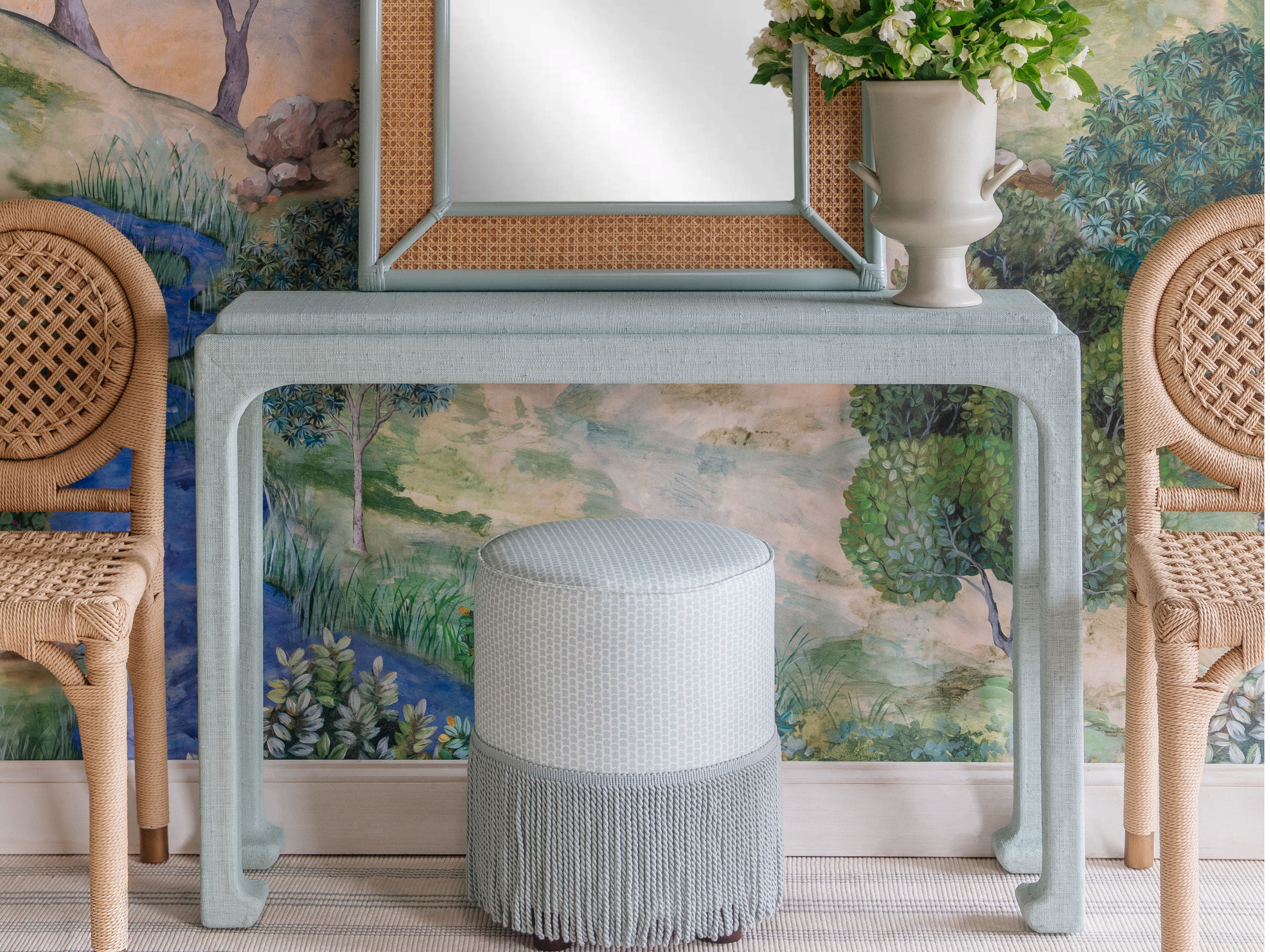 - Mahogany frame hand-wrapped in natural grasscloth